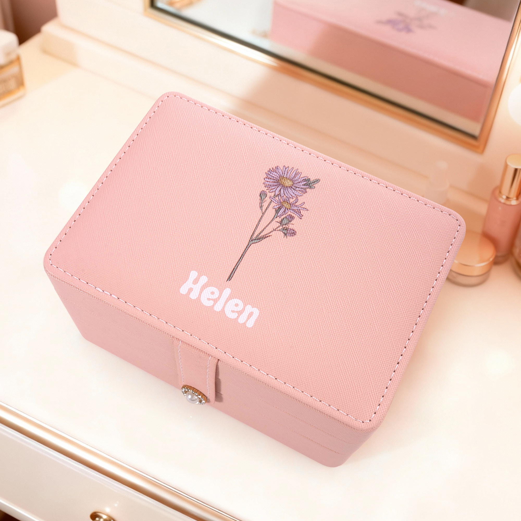 Custom Birth Flower & Name Travel Makeup Box, Multi-functional Makeup Mirror Box, Jewelry/Cosmetics Storage Box, Birthday Gift for Her